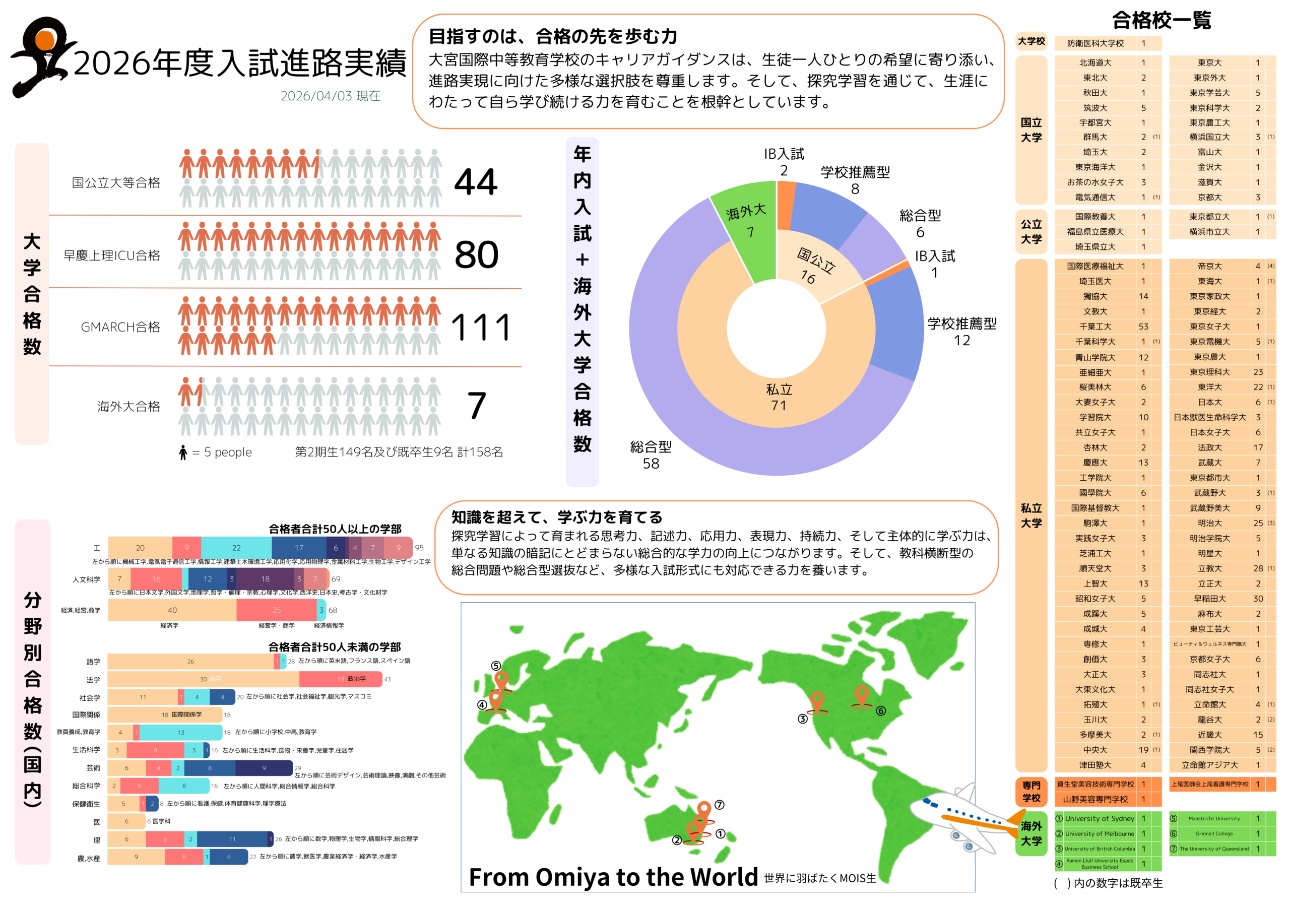 大宮国際中等教育のキャリアガイダンスは、生徒一人ひとりの希望に寄り添い、進路実現に向けた多様な選択肢を尊重します。そして、探究学習を通じて、生涯にわたって自ら学び続ける力を育むことを根幹としています。
